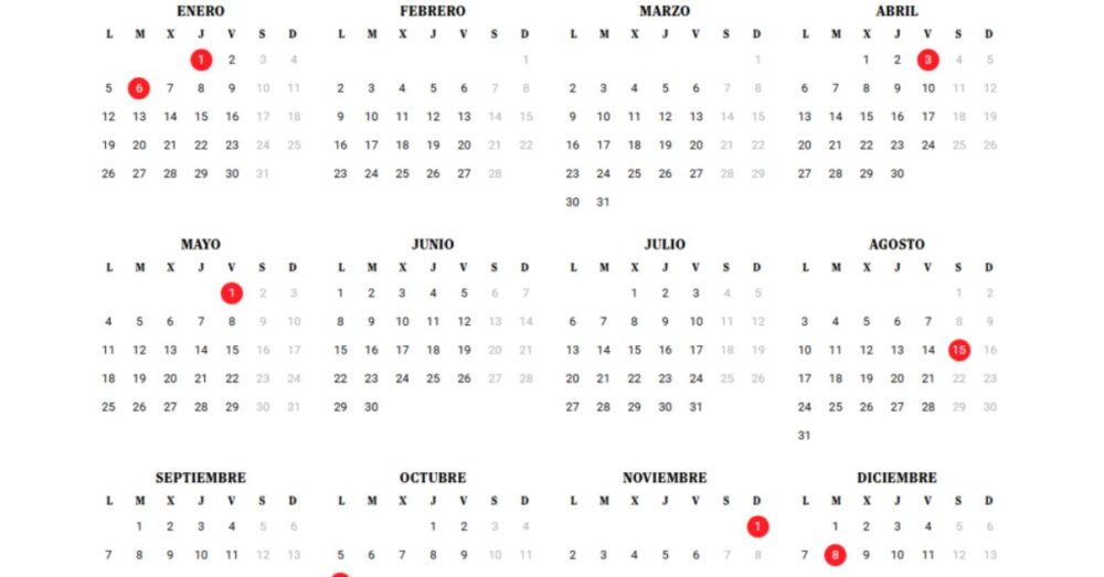 Además de estos puentes, el calendario laboral de 2026 contempla 14 días festivos nacionales, de los cuales 9 son obligatorios en todo el país: Año Nuevo (1 de enero), Viernes Santo (3 de abril), Fiesta del Trabajo (1 de mayo), Asunción de la Virgen (15 de agosto), Fiesta Nacional (12 de octubre), Todos los Santos (1 de noviembre), Constitución (6 de diciembre), Inmaculada Concepción (8 de diciembre) y Navidad (25 de diciembre).