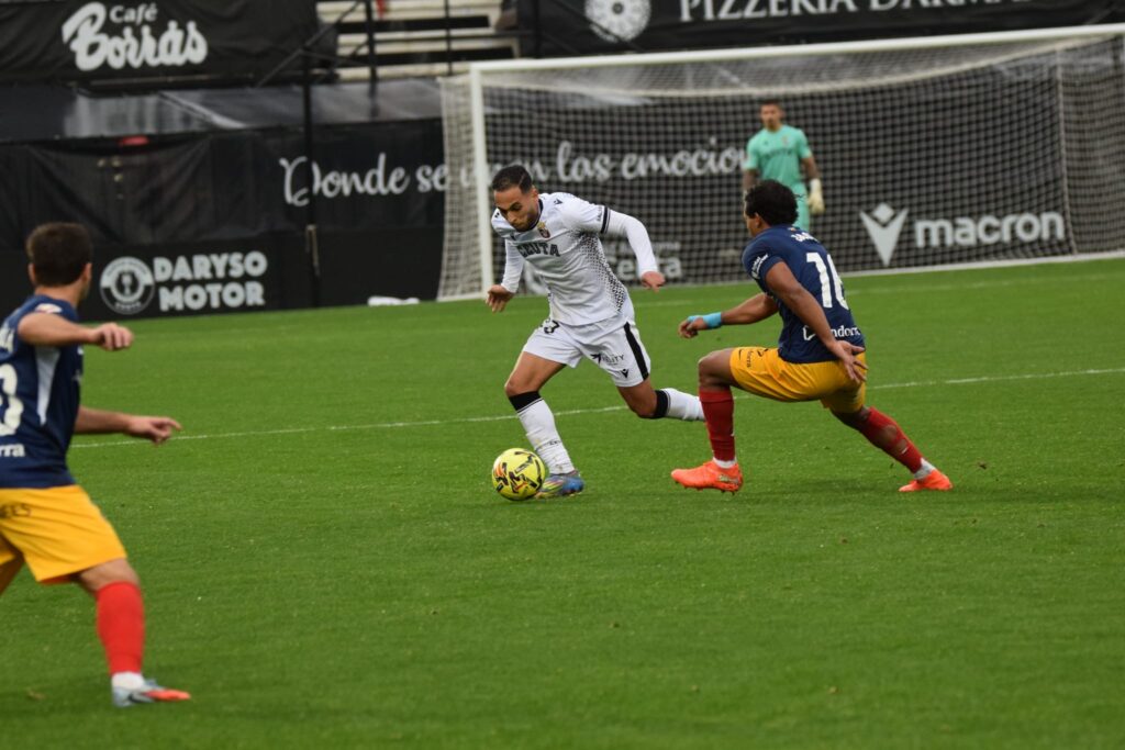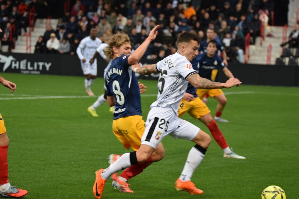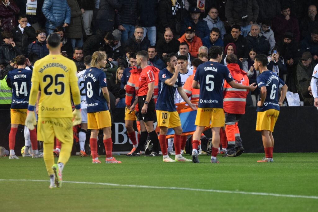 La primera ocasión clara fue para los locales. Yann Bodiger ejecutó una falta lejana con potencia y colocación, estrellando el balón en el larguero y rozando un gol que habría cambiado el guion del partido. La respuesta del Andorra llegó con un disparo raso de Justin García que obligó a Vallejo a intervenir con seguridad sobre el césped mojado.