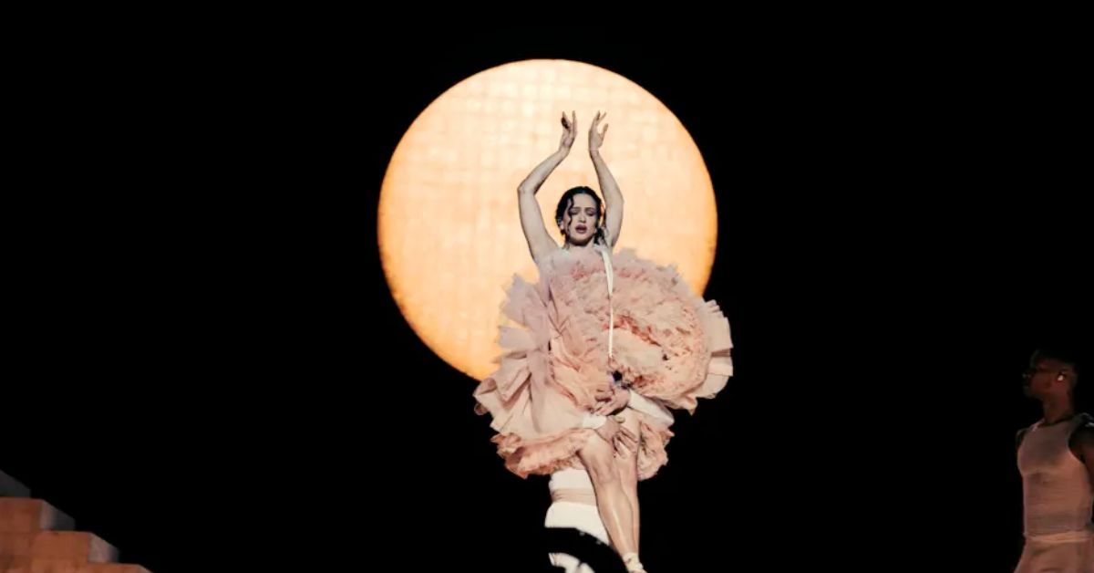 El espectáculo comienza evocando el universo del ballet y la disciplina artística. Rosalía inicia su actuación emergiendo de una caja, una escenografía que remite a la emblemática escultura de Edgar Degas, ‘La Pequeña Bailarina de Catorce Años’, que se encuentra en la Galería Nacional de Arte de París. Vestida con un tutú ligero, interpreta temas como ‘Sexo, Violencia y Llantas’, ‘Divinize’ y ‘Reliquia’, representando la exigencia física como instrumento creativo.