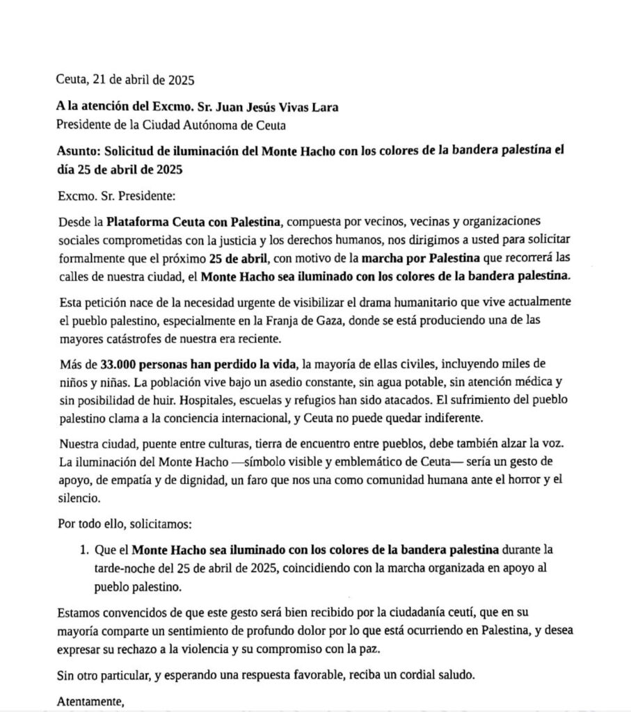 Ceuta, 21 de abril de 2025 – La Plataforma Ceuta con Palestina, respaldada por colectivos vecinales, organizaciones sociales y ciudadanas comprometidas, ha solicitado formalmente al Gobierno de la Ciudad Autónoma de Ceuta la iluminación del Monte Hacho con los colores de la bandera palestina el próximo 25 de abril, coincidiendo con la gran marcha convocada en solidaridad con el pueblo palestino.