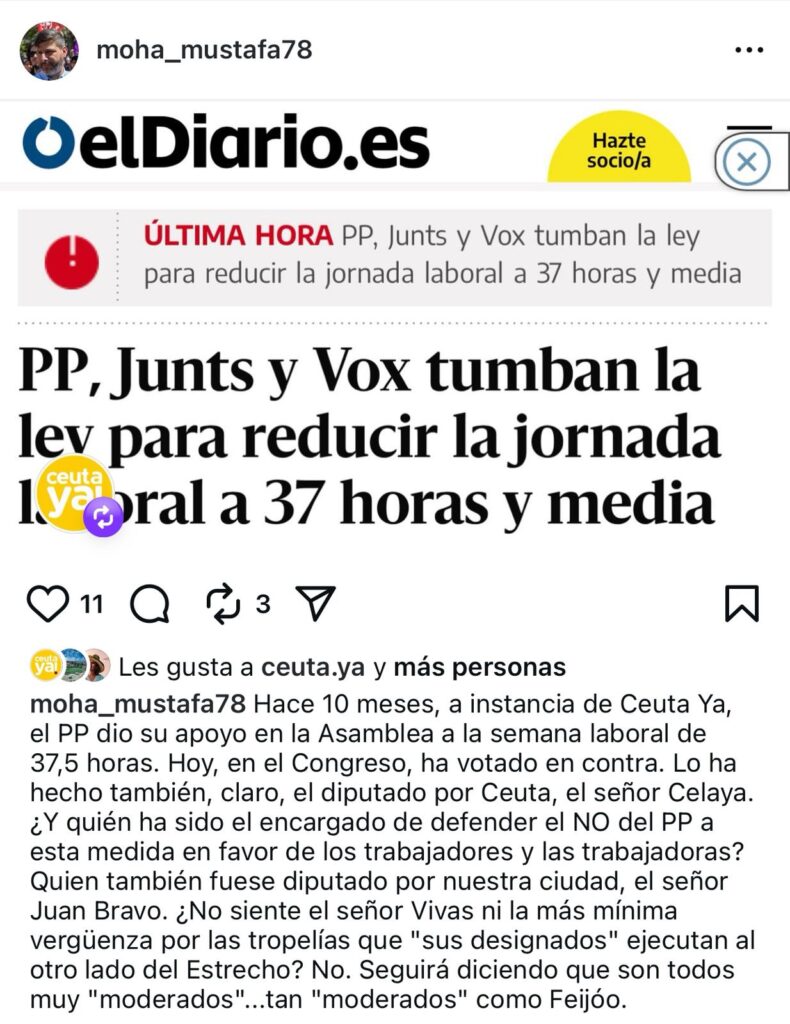 El Partido Popular ha vuelto a situarse en el centro de la polémica tras votar en contra, en el Congreso de los Diputados, de la reducción de la jornada laboral a 37,5 horas. Una decisión que contrasta con el apoyo que los populares dieron hace apenas diez meses en la Asamblea de Ceuta, a propuesta de Ceuta Ya!