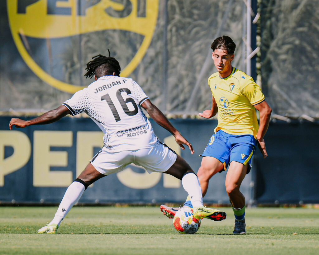 El partido comenzó con ritmo e intensidad por parte de ambos conjuntos, que alternaban llegadas sin conseguir abrir el marcador. La defensa blanquinegra se mostraba firme ante los intentos del filial gaditano, mientras los caballas buscaban sorprender a la contra.